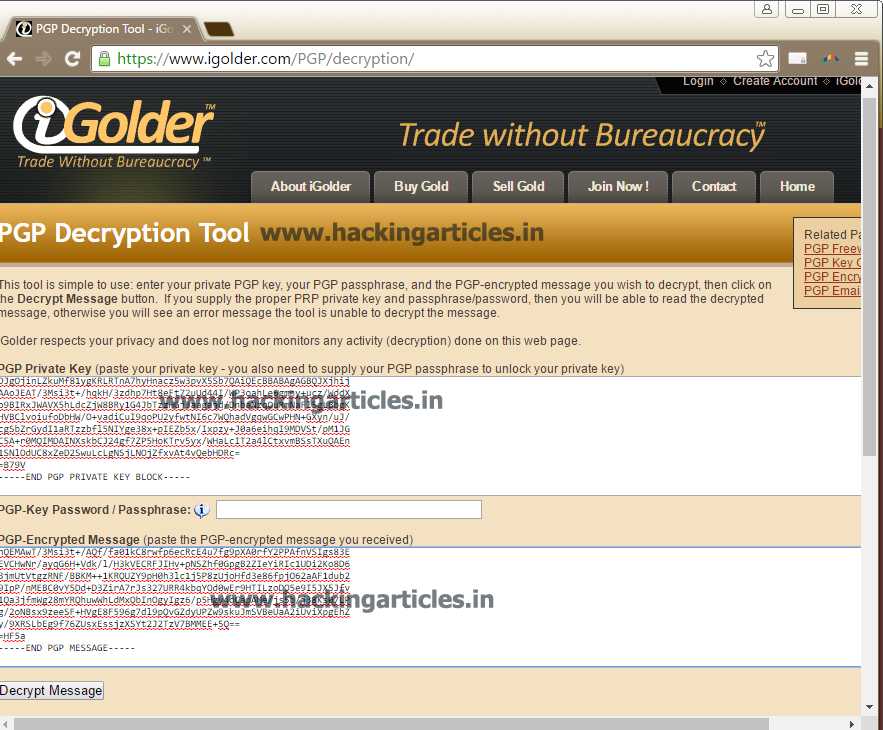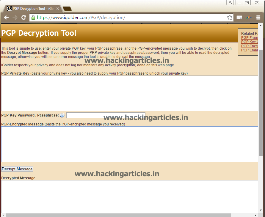 Now, copy this encrypted message to the desired person along with the private key which you generated in the first step. The same person can also visit this site and click on PGP decrypt message option to decrypt the message. After clicking on the said option, the following page will open: