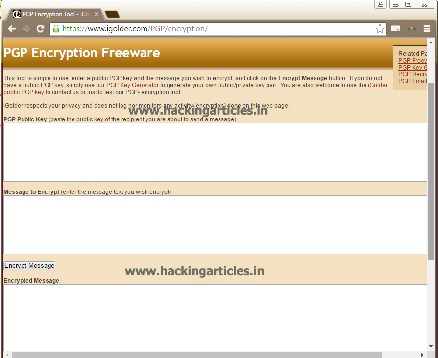 Now, copy the public key and click on PGP encrypt message option, it will redirect to the following page