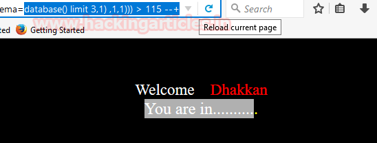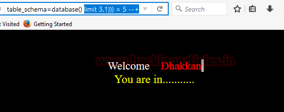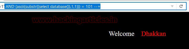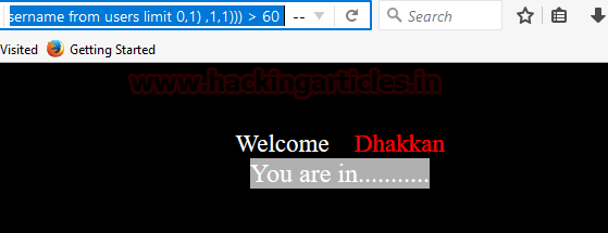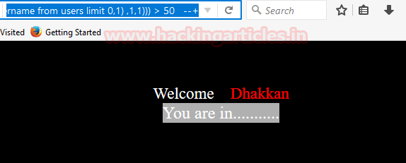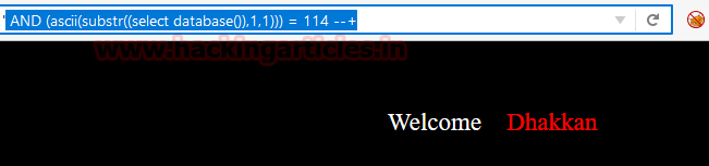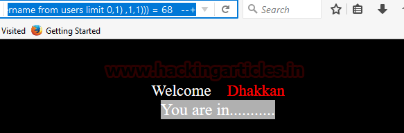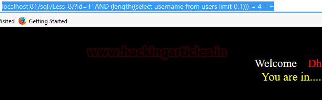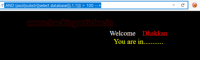 Similarly, we will inject given below query which will ask whether the length of database string is equal to 1. In the response of that query it will answer by returning TRUE or FALSE through text “you are in”.