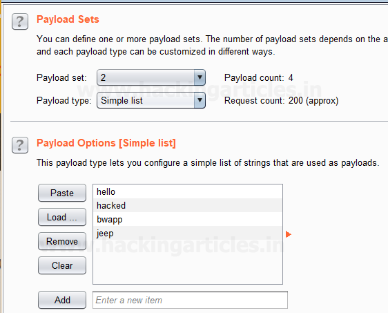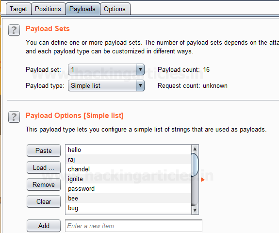 Now to attack at the password field we will select Payload type as Simple list for Payload Set ‘2’ for which we have added a dictionary manually created by us by using the Load option.