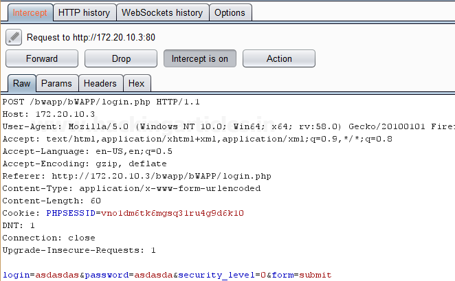 First, we have intercepted the request of the login page in the Bwapp LAB, where we have given wrong username and password. Then click on login, the burp suite will capture the request of the login page in the intercept tab.