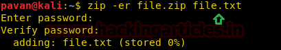 John the Ripper can crack the ZIP file passwords. To test the cracking of the password, first, let’s create a compressed encrypted zip file.