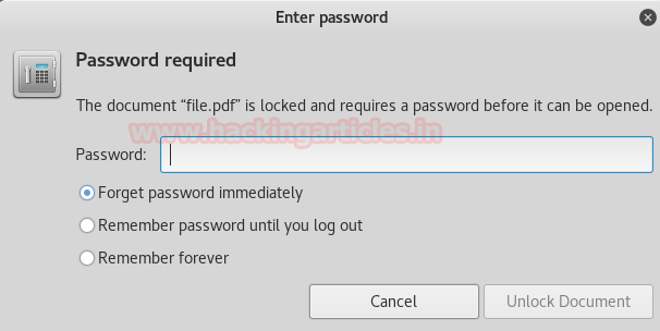 John the Ripper can crack the PDF file passwords. You can encrypt your pdf online by using this website. This will compress and encrypt our pdf into a password protected file.pdf. So, when you will try to open the file, you will be greeted by the following prompt.