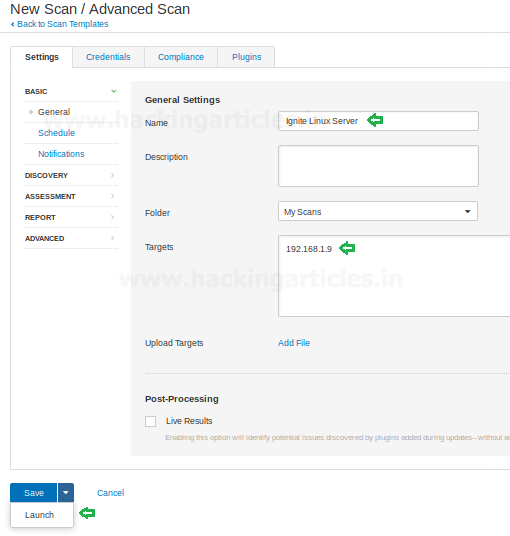 In order to start a new scan, go to scan templates and select a new scan and then give it a name and target IP as shown in the following image :