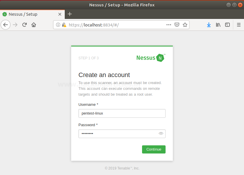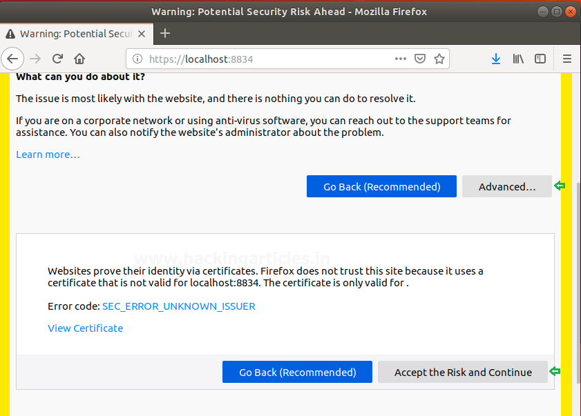This command will open our default browser, which in our case is Mozilla Firefox. And we will be greeted with a Warning about Certificate Installation. To use Nessus, we will have to get through this warning. The first click on Advanced followed by Accept the Risk and Continue.