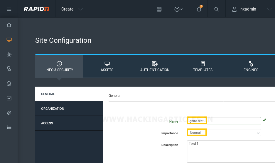 In order to start with a new scan, go to the home page, click the Create dropdown and select Site. The Security Console will display the “Site Configuration” screen.