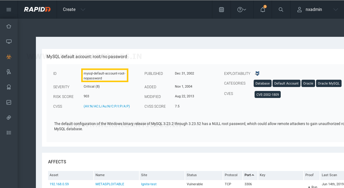 When we click on a particular vulnerability, for an instance here we’ve clicked on MySQL default account which is a critical threat, it will give us the information about the vulnerability such as its severity, whether it is password protected or not, its version, etc. as shown in the image below.