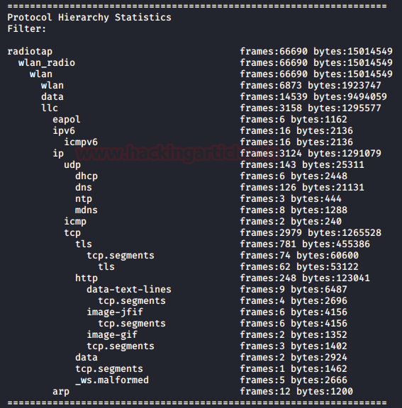 Using the TShark we can create a Protocol based Hierarchy Statistics listing the number of packets and bytes using the “io,phs” option in the “-z” parameter. In the case where no filter is given after the “io,phs” option, the statistics will be calculated for all the packets in the scope. But if a specific filter is provided than the TShark will calculate statistics for those packets that match the filter provided by the user. For our demonstration, we first captured some traffic and wrote the contents on a pcap file using the techniques that we learned in part 1 of this article series. Then we will be taking the traffic from the file, and then sort the data into a Protocol Hierarchy. Here we can observe that we have the frames count, size of packets in bytes and the Protocol used for the transmission.