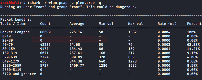 As long as we are talking about the Tree option, let’s explore it a bit. We have a large variety of ways in which we can use the tree option in combination with other option. To demonstrate that, we decided to use the packet length option with the tree option. This will sort the data on the basis of the size of the packets and then generate a table with it. Now, this table will not only consist of the length of the packets, but it will also have the count of the packet. The minimum value of the length in the range of the size of the packets. It will also calculate the size as well as the Percentage of the packets inside the range of packet length