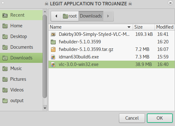 After selecting the payload another window will open titled Legit Application to Trojanize