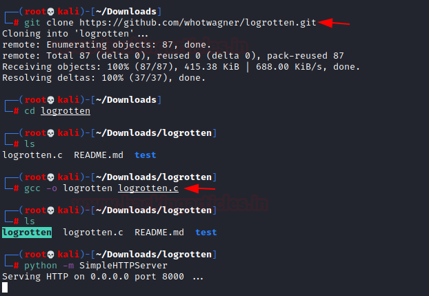 git clone https://github.com/whotwagner/logrotten.git cd logrotten gcc -o logrotten logrotten.c python -m SimpleHTTPServer