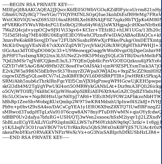 -----BEGIN RSA PRIVATE KEY----- MIIEpQIBAAKCAQEA2JJQsccK6fE05OWbVGOuKZdf0FyicoUrrm821nHygmLgWSpJ G8m6UNZyRGj77eeYGe/7YIQYPATNLSOpQIue3knhDiEsfR99rMg7FRnVCpiHPpJ0 WxtCK0VlQUwxZ6953D16uxlRH8LXeI6BNAIjF0Z7zgkzRhTYJpKs6M80NdjUCl/0 ePV8RKoYVWuVRb4nFG1Es0bOj29lu64yWd/j3xWXHgpaJciHKxeNlr8x6NgbPv4s 7WaZQ4cjd+yzpOCJw9J91Vi33gv6+KCIzr+TEfzI82+hLW1UGx/13fh20cZXA6PK 75I5d5Holg7ME40BU06Eq0E3EOY6whCPlzndVwIDAQABAoIBAQCs+kh7hihAbIi7 3mxvPeKok6BSsvqJD7aw72FUbNSusbzRWwXjrP8ke/Pukg/OmDETXmtgToFwxsD+ McKIrDvq/gVEnNiE47ckXxVZqDVR7jvvjVhkQGRcXWQfgHThhPWHJI+3iuQRwzUI tIGcAaz3dTODgDO04Qc33+U9WeowqpOaqg9rWn00vgzOIjDgeGnbzr9ERdiuX6WJ jhPHFI7usIxmgX8Q2/nx3LSUNeZ2vHK5PMxiyJSQLiCbTBI/DurhMelbFX50/owz 7Qd2hMSr7qJVdfCQjkmE3x/L37YQEnQph6lcPzvVGOEGQzkuu4ljFkYz6sZ8GMx6 GZYD7sW5AoGBAO89fhOZC8osdYwOAISAk1vjmW9ZSPLYsmTmk3A7jOwke0o8/4FL E2vk2W5a9R6N5bEb9yvSt378snyrZGWpaIOWJADu+9xpZScZZ9imHHZiPlSNbc8/ ciqzwDZfSg5QLoe8CV/7sL2nKBRYBQVL6D8SBRPTIR+J/wHRtKt5PkxjAoGBAOe+ SRM/Abh5xub6zThrkIRnFgcYEf5CmVJX9IgPnwgWPHGcwUjKEH5pwpei6Sv8et7l skGl3dh4M/2Tgl/gYPwUKI4ori5OMRWykGANbLAt+Diz9mA3FQIi26ickgD2fv+V o5GVjWTOlfEj74k8hC6GjzWHna0pSlBEiAEF6Xt9AoGAZCDjdIZYhdxHsj9l/g7m Hc5LOGww+NqzB0HtsUprN6YpJ7AR6+YlEcItMl/FOW2AFbkzoNbHT9GpTj5ZfacC hBhBp1ZeeShvWobqjKUxQmbp2W975wKR4MdsihUlpInwf4S2k8J+fVHJl4IjT80u Pb9n+p0hvtZ9sSA4so/DACsCgYEA1y1ERO6X9mZ8XTQ7IUwfIBFnzqZ27pOAMYkh sMRwcd3TudpHTgLxVa91076cqw8AN78nyPTuDHVwMN+qisOYyfcdwQHc2XoY8YCf tdBBP0Uv2dafya7bfuRG+USH/QTj3wVen2sxoox/hSxM2iyqv1iJ2LZXndVc/zLi 5bBLnzECgYEAlLiYGzP92qdmlKLLWS7nPM0YzhbN9q0qC3ztk/+1v8pjj162pnlW y1K/LbqIV3C01ruxVBOV7ivUYrRkxR/u5QbS3WxOnK0FYjlS7UUAc4r0zMfWT9TN nkeaf9obYKsrORVuKKVNFzrWeXcVx+oG3NisSABIprhDfKUSbHzLIR4= -----END RSA PRIVATE KEY-----