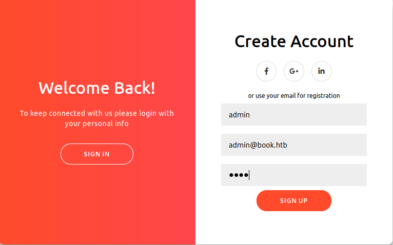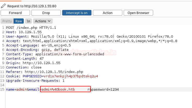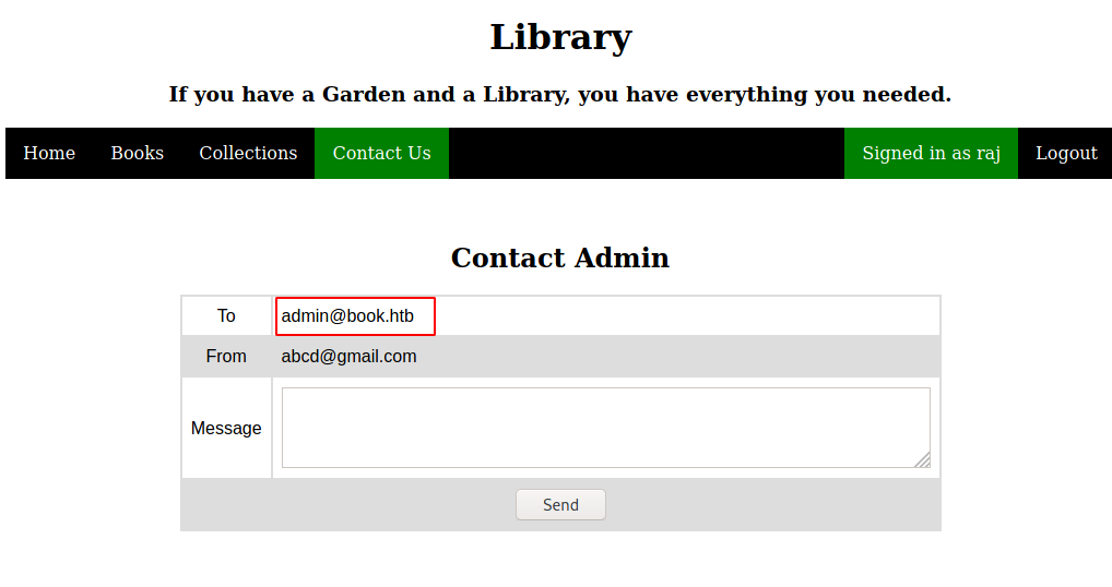 While enumerating the application, we stumbled upon the email address for the user admin. It is admin@book.htb