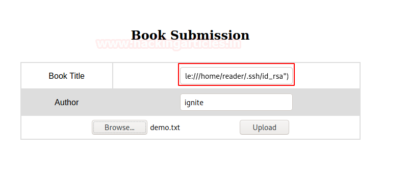 We went back to the User Panel into Book Submission and this time we gave the path for the id_rsa file.