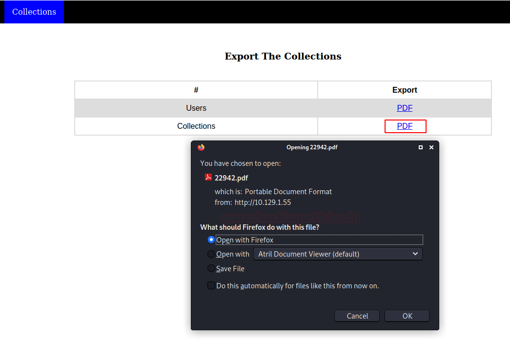 Again, getting back to the Admin Panel and Clicking on the PDF link in the Collection Tab we have the SSH key that can be used to login into the application.