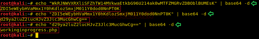 We went back to the commented encoded text we found earlier in the Source code of the webpage. It seemed like Base64, so we tried to decode it using base64 command. It gave back another encoded text. This also seemed like Base64, so we decoded it again. This gave back another encoded text. This is getting really tiring. Now we decoded it again to find workinginprogress.php. Not this seems important. All those decodings were not gone for waste.