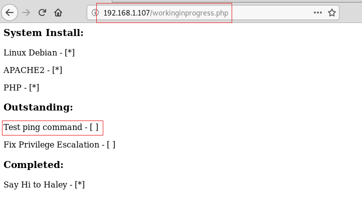 We tried to open this file on our Web Browser as shown in the image given below. It was a checklist of some kind. It showed that Linux Debian is installed, Apache2 is installed and PHP is also installed. But the stuff that’s not completed tests the ping command and fix the privilege escalation. These seem like major hints.