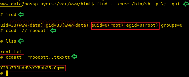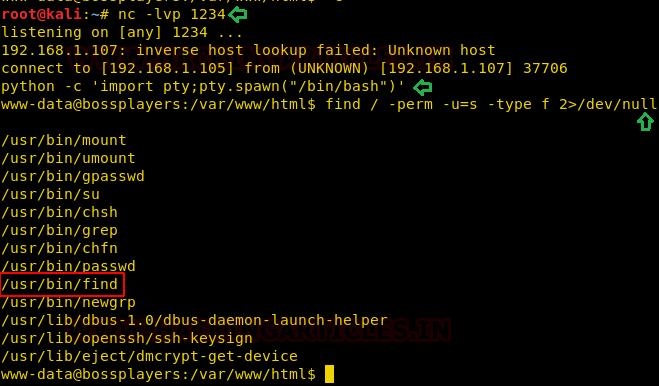 As a part of our enumeration procedure, we ran the find command with -perm parameter to search for any file having SUID permissions. The find command itself has this permission. This made our job a little easy.