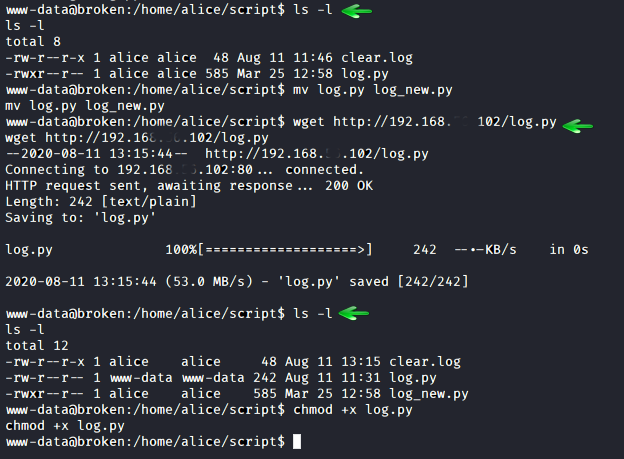 Here is the catch: upon inspecting clear.log we found that the logs were being cleared after every 1 minute sharp. This could be due to a cron job. Since the script log.py is being run as alice we could gain Alice’s account access if we somehow manage to insert our reverse shellcode in log.py.