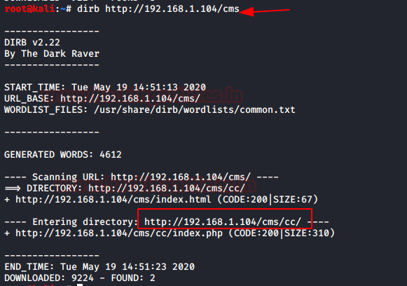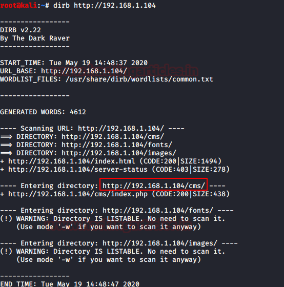 Next obvious step was to run directory enumeration. We used dirb for the purpose and found a directory “/cms”
