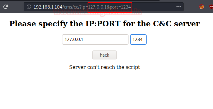 A new directory called “/cc/” seemed to have been created by this installation. We head over there to see what had been created. As the page explains itself, it is a malicious script that is used to connect the server to a remote IP with a remote port! That means a ready-made shell. But let’s see what it actually does first by inputting a random IP and port.