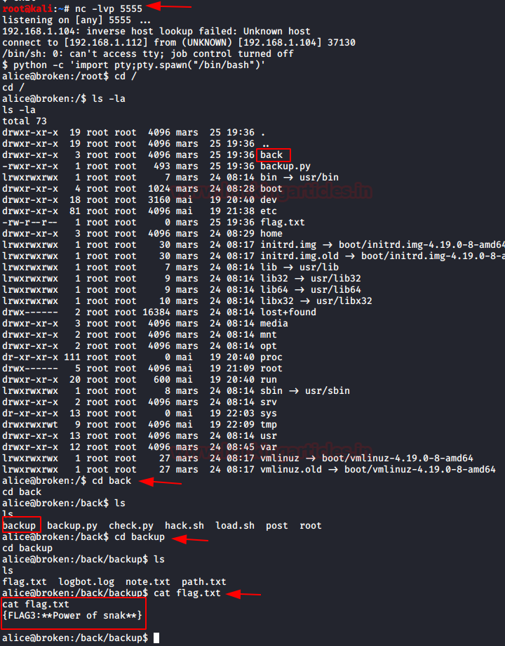 Surely, we received Alice’s shell. Now we traversed through directories and found a /back directory with the backup folder. There we snagged our third flag!
