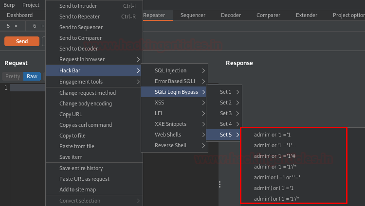 Here in the Request content, let’s select the injection points “uname” and “pass” and then follow up with a right-click to Hack Bar -> SQLi Login Bypass -> Set 1 -> ‘or’‘=’ dictionary value.