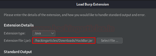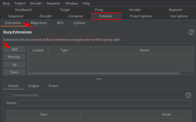As soon as the file gets downloaded, we’ll tune back into our burpsuite monitor and will navigate to the Extensions section in the Extender tab. There we’ll hit the Add button in order to pull the “Load Burp Extension” window.