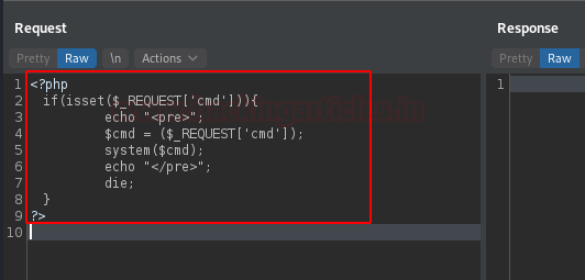 In Burp Suite’s Repeater tab, open a new section. Then, right-click on the empty portion of the Request bar. Afterward, navigate to Hack Bar -> Web Shells -> php.