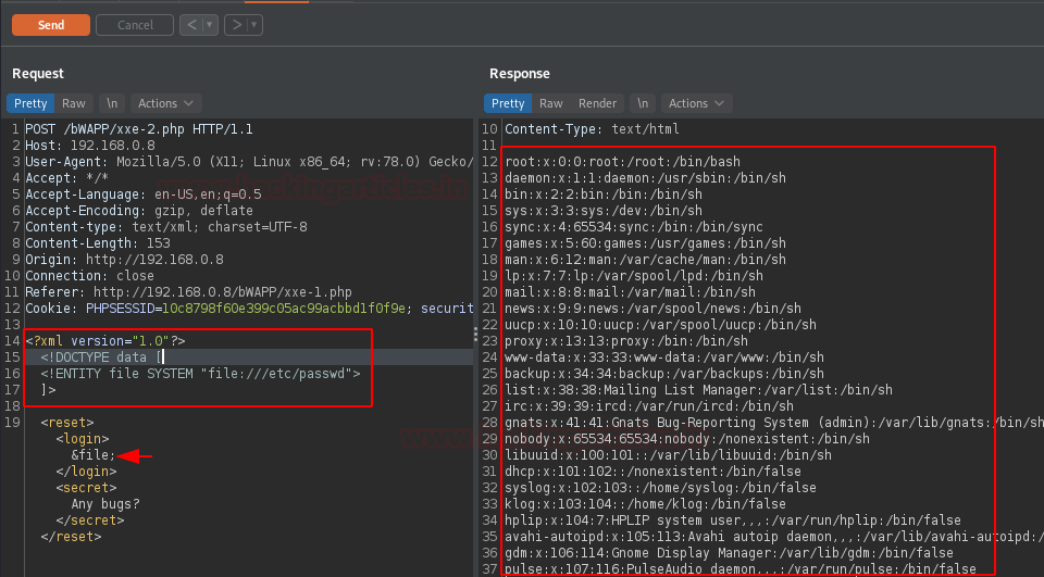 As the payload got injected, replace bee with the entity name (file) as “ &file; ”, and then fire the Send button. And within a few seconds, we got the password file over at our right eye.