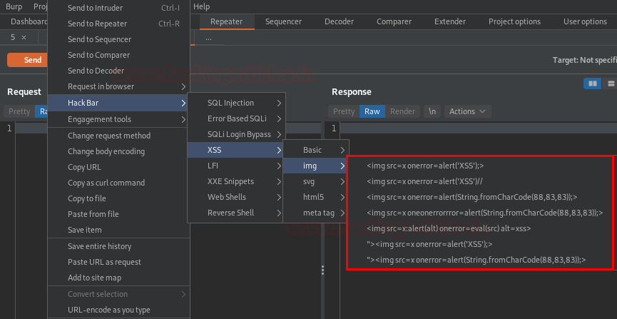 Hackbar has been designed in such a way that it targets a number of crucial vulnerabilities. The dictionaries within it are segregated according to the type they belong to. However, we can use this Hackbar or its dictionaries wherever we wish, whether it’s in the Repeater tab while manipulating the requests or in the Proxy tab during interception.