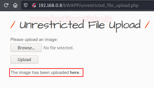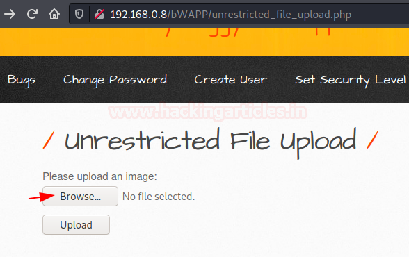 Now time to hit the vulnerability, back into the bWAPP application and opt Unrestricted File Upload.