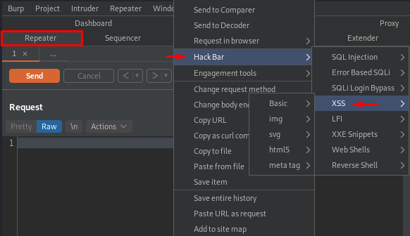 Follow up at the repeater tab and make a right-click anywhere at the screen. Over with that, we can see a new option lined up as “Hackbar”.