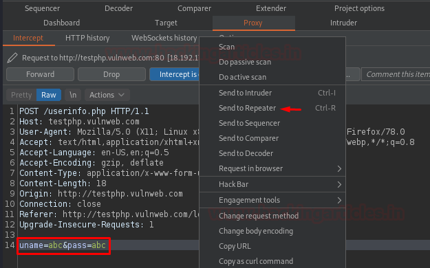 Once the request got captured by the burpsuite simply share it with the Repeater.