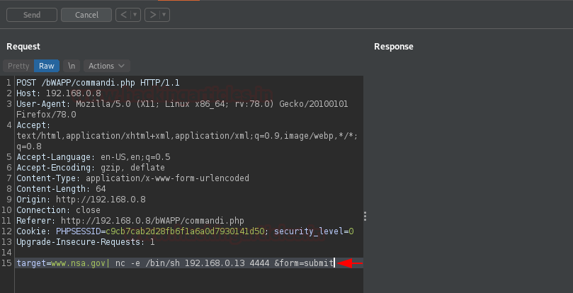 Before hitting the “Send” button let’s initiate our netcat listener at our Kali machine with