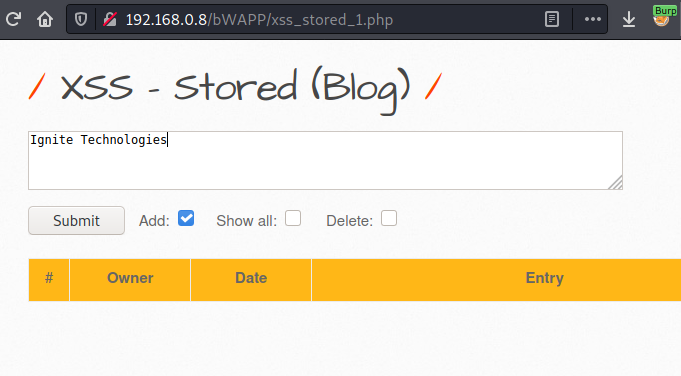 Open the target IP in the browser and login inside bWAPP as a bee: bug, further set the “Choose Your Bug” option to “XSS –Stored” and fire up the hack button.