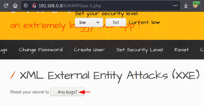 This time switch to the XML External Entity Attacks web-page and push the “Any bugs?” button with the proxy service ON.
