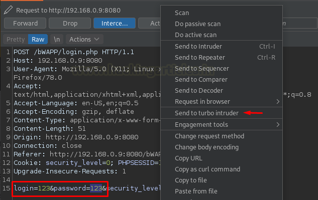 Back into the intercept tab, we’ll select the payload position and will then hit right-click in order to share the request to the Turbo Intruder.