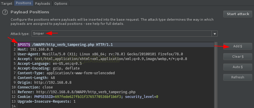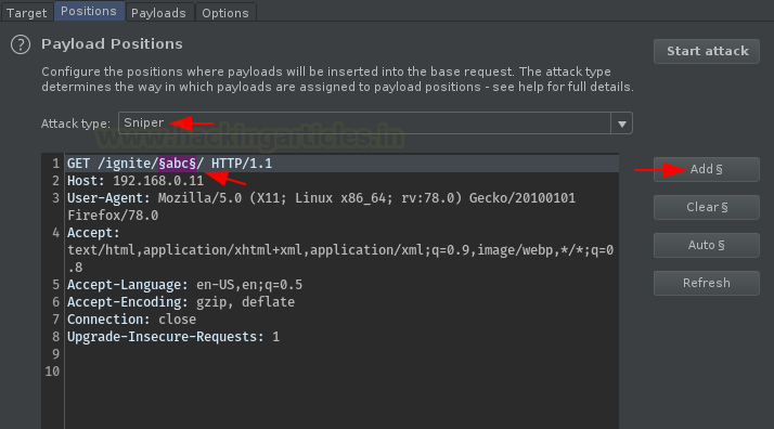 Let’s now configure the input parameters, hit the “Add” button to set the payload position with “ignite”, and set the Attack type to “Sniper”.