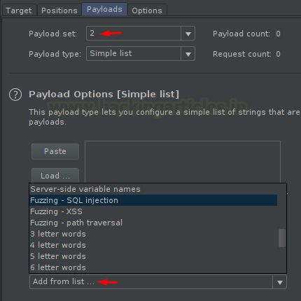 Let’s first select the predefined lists, here we’re using the most favourable list i.e. “Fuzzing – XSS”.