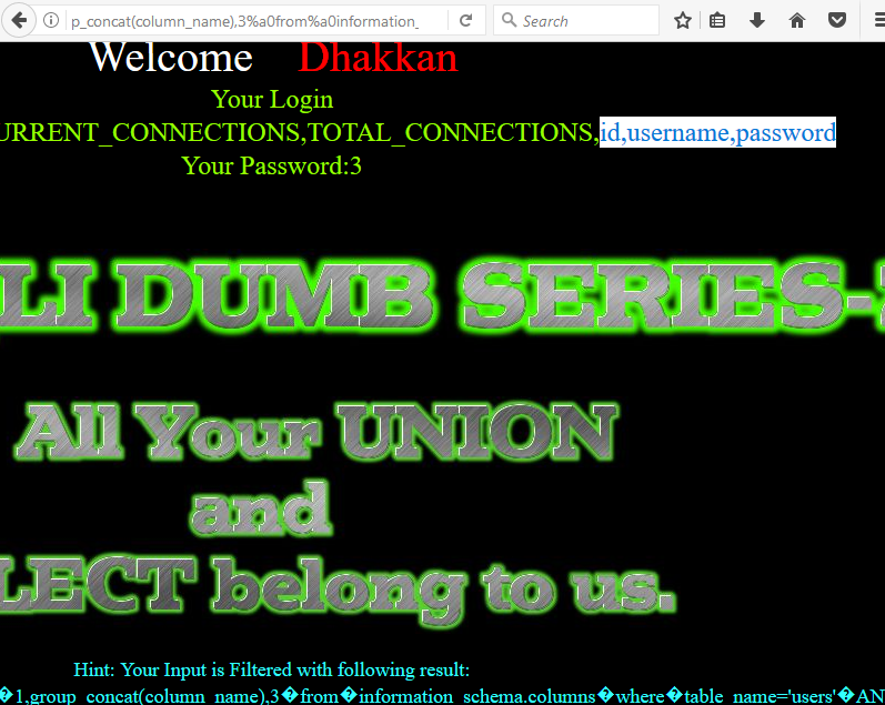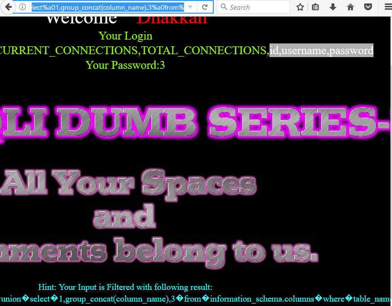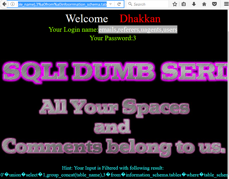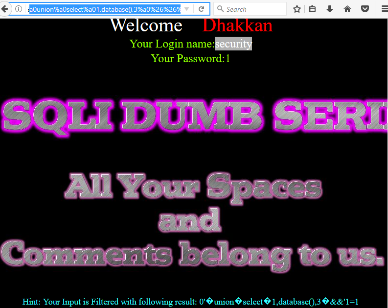 Once the concept is clear to bypass UNION/union, SELECT/select and SPACE filter later we need to alter the SQL statement for retrieving database information.