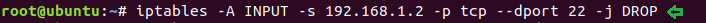 iptables -A INPUT -s 192.168.1.2 -p tcp --dport 22 -j DROP